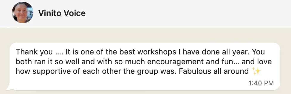 " I feel really loved up after this workshop. It really cleared a lot of my inner negative self critic... It makes me feel like I can finally do this most vulnerable thing in my life which is to sing in public... and I'm going to keep singing all my life regardless. "