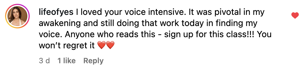 I took Yin Ling's voice intensive because I knew I had a fear of singing in front of anyone - I wouldn’t even do karaoke. Little did I know that this course would be healing in so many ways. I found my voice, brought love to the parts of me that didn’t feel heard or seen, and transformed something so deep inside of me. Best part? I got to heal with a community of amazing, supportive humans who created such a safe space for me to express my truth. I now have the courage to sing in front of others and it’s so liberating. I honestly would recommend the voice intensive to anyone who wants to discover a new side to themselves!